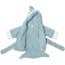 -Sea blue terry robe with white cuffs, two terry ties in front, a hood with smiling, white shark's teeth, appliqued black eyes and a dorsal fin accent