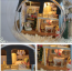 The dollhouse is the short version of a real house, and it is adorable. The material of the dollhouse is real wood like a house. The cabinet is made of wood, the window curtains are make of cloth, and the books are make of paper. LED lights included to light up the inside of the house.